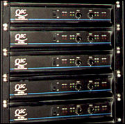 Wzmacniacze QSC z serii MX są jednymi z niewielu dostępnych urządzeń, które działają stabilnie nawet przy obciążeniu 2 Ohmów. MX1500a jest dwukanałowym wzmacniaczem, który przy obciążeniu 8ohmów daje 400W na kanał. Przy 4 Ohmach daje 600W na kanał, a przy 2 Ohmach aż 750W mocy na kanał! Zastosowano 5 takich wzmacniaczy, które zasilają kolejno kanały: lewy, centralny, prawy, surround lewy, surround prawy. Na pierwszy rzut oka może się to wydawać trochę dziwne, że każdy z dwukanałowych wzmacniaczy MX1500a zasila po jednym kanale, realizując w ten sposób trzy kanały główne (lewy, centralny, prawy), oraz dwa kanały surround (lewy i prawy). Otóż cała rzecz polega na tym, że jeden kanał wzmacniacza zasila głośnik wysokotonowy, a drugi kanał zasila głośnik niskotonowy (nie mylić z subwooferem - o tym później). Dla przykładu weźmy pod uwagę tylko kanał centralny, który jest reprezentowany przez kolumnę stojąca po środku za ekranem: Taka kolumna jest zasilana wzmacniaczem dwukanałowym w ten sposób, że jeden kanał wzmacniacza zasila jedynie głośnik (tubę) wysokotonowy, a drugi kanał wzmacniacza zasila wszystkie niższe częstotliwości - czyli głośnik (głośniki) nisko-średniotonowy. Innymi słowy rozdział częstotliwości następuje jeszcze przed wzmacniaczem, a w kolumnach nie ma już żadnych filtrów częstotliwościowych.