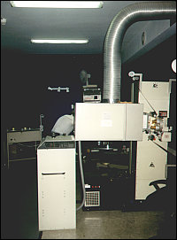 ![]() Projektor niemieckiej marki Kinoton FP30, wraz ze sprzętem zasilającym: czyli prostownikiem, i generatorem. W tle widać przewijarkę dla taśm filmowych i... plecy pana Bogusława :-) |