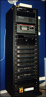 ![]() Na zdjęciu widać od góry: panel kontrolny z możliwością podsłuchu każdej ze ścieżek, która aktualnie jest dekodowana dekoderem Dolby CP500, następnie niżej jest dekoder Dolby - CP500, a jeszcze niżej zwykły odtwarzacz MiniDisc niezbędny np. do odtwarzania muzyki między seansami. |
