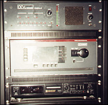 ![]() Na zdjęciu widać od góry: panel kontrolny z możliwością podsłuchu każdej ze ścieżek, która aktualnie jest dekodowana dekoderem Dolby CP500, następnie niżej jest dekoder Dolby - CP500, a jeszcze niżej zwykły odtwarzacz MiniDisc niezbędny np. do odtwarzania muzyki między seansami. |