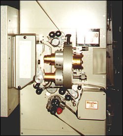 ![]() Platter, system projekcji poziomej z jednego projektora, z zasobnika 3 talerzowego AWR - pojemność 8000 metrów filmu (4,5 godzinna projekcja). Trzeci talerz służy do niezależnego przygotowania drugiego filmu. |