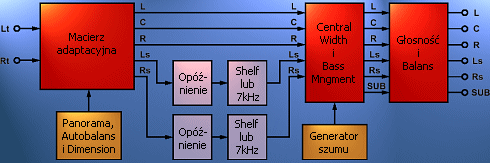 Jest jeszcze łagodny filtr wysokiej częstotliwości (shelf) wprowadzony na kanały surround dla trybu Music. W rezultacie otrzymujemy bardziej naturalne pole dźwiękowe.