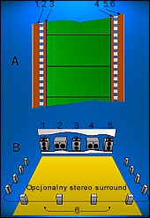 ![]() 70mm magnetic: prekursor dzisiejszego cyfrowego dźwięku. W latach 50-tych taśmy filmowe z magnetycznymi paskami zawierającymi ścieżki dźwiękowe dostarczyły po raz pierwszy wielokanałowego dźwięku, który usłyszała publiczność. 70mm taśma filmowa (A), dla przykładu, cechuje się sześcioma ścieżkami, skonfigurowanymi jako pięć identycznych kanałów z przodu, oraz kanał surround po bokach i z tyłu sali (B). |