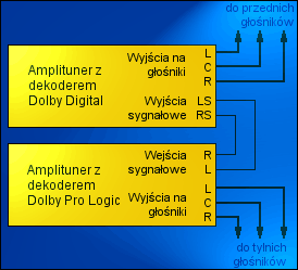 Ogólnie mówiąc to co musisz zrobić, to doprowadzić kanały lewy surround i prawy surround z dekodera Dolby Digital na wejście dekodera/amplitunera Dolby Surround Pro Logic. Później podłączasz już trzy lub cztery głośniki surround.
